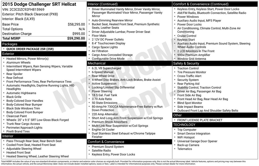 This 2015 DODGE CHALLENGER SRT HELLCAT runs the 6.2L V8 SUPERCHARGED ENGINE. It doesn't sneak around it announces itself. The 6-SPEED MANUAL TREMEC TRANSMISSION keeps you fully involved, the way a car like this should.